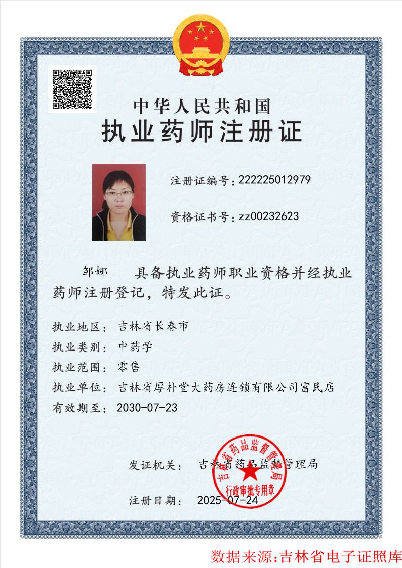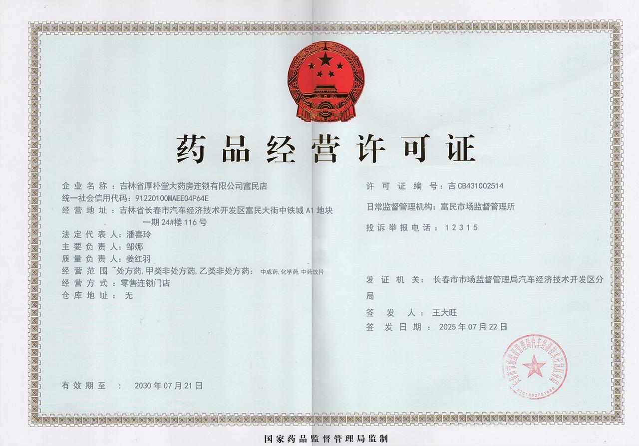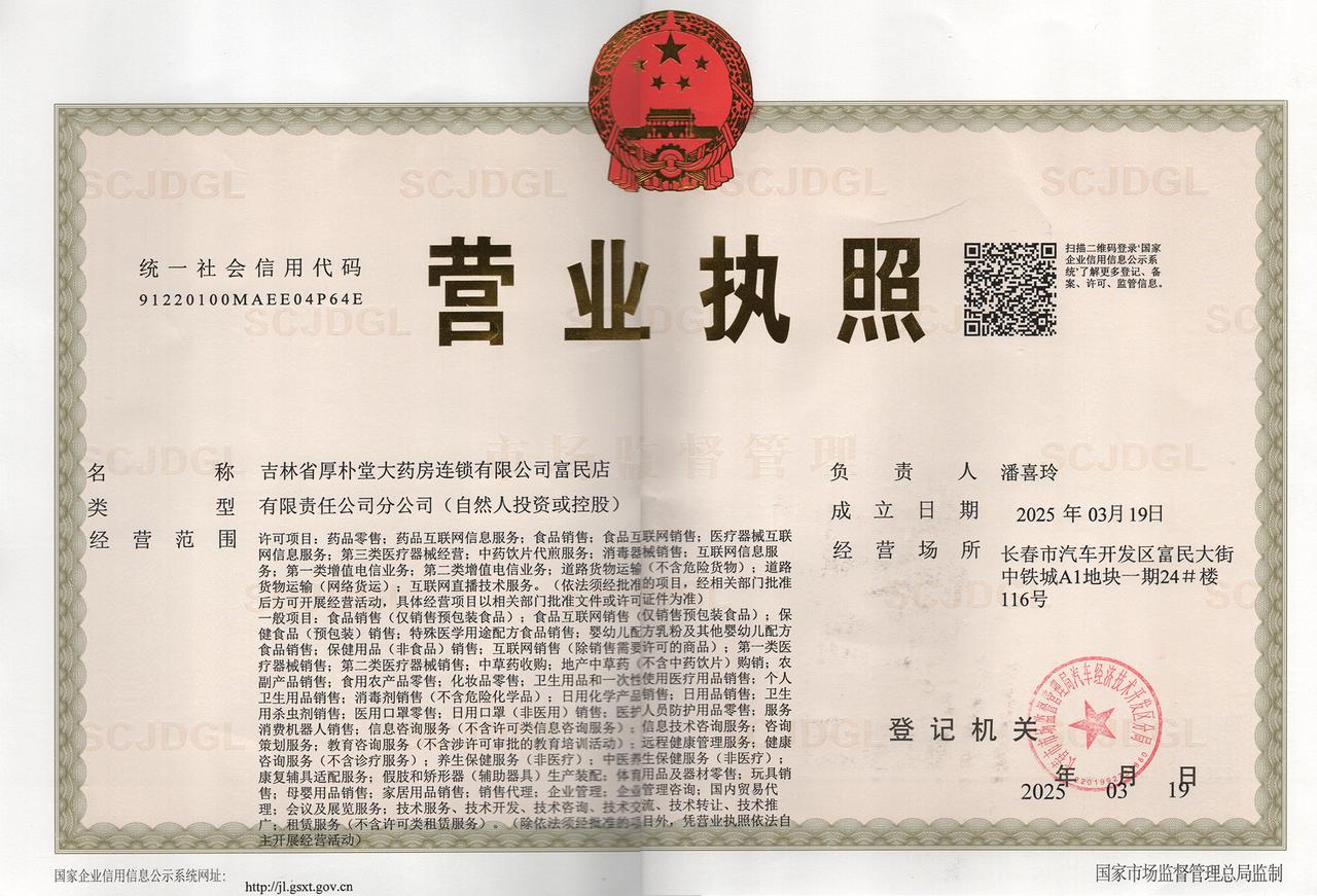 公司简介:吉林省厚朴堂大药房连锁有限公司富民店成立于2025年03月19日,经营地址位于吉林省长春市汽车经济技术开发区富民大街中铁城A1地块一期24#楼116号,法定代表人为潘喜玲。经营范围包括一般项目:凭总公司授权经营活动。(除依法须经批准的项目外,凭营业执照依法自助主开展经营活动。)